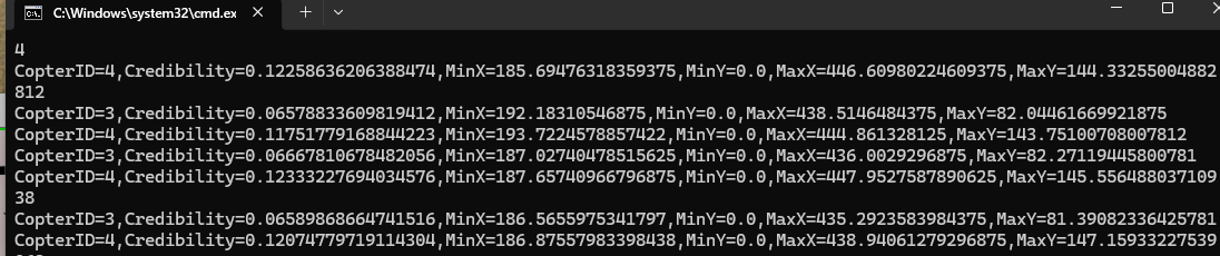 具体地,本传感器输出识别目标的 CopterID、可信度(Credibility)、目标边界框坐标(MinX, MinY, MaxX, MaxY)等关键参数。